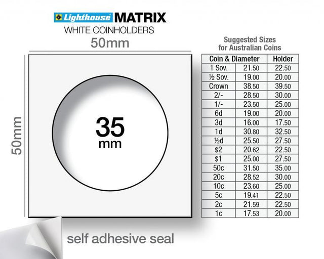 Coin Holder 2x2s Self Adhesive 35mm Fits 50c - Pack of 25 - Lighthouse MATRIX is backordered and will ship as soon as it is back in stock.