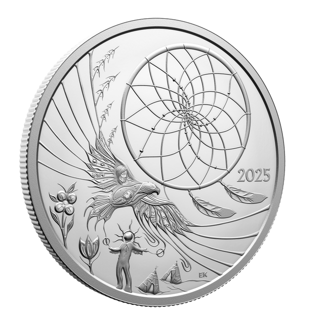 More than a collectible, this 1 oz. 99.99% pure silver coin is a powerful tribute to Ojibwe heritage, brought to life through the artist’s representation of the dreamcatcher tradition. Crafted with deep intentionality, the design focuses on a matriarch, the creator of the dreamcatcher positioned at the top who is also seen nurturing her child within the form of the soaring Eagle that is a sacred connection to the Creator. From healing florals to wigwams representing community, every engraved element beautifully reflects the Ojibwe understanding of balance, protection and the interconnectedness of all living things.