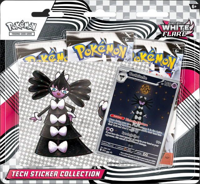 Gothitelle can see the future in the stars—perhaps it knows which path you’ll take! Team up with the Astral Body Pokémon as a foil promo card, then decorate your computer, tablet, or phone with durable tech stickers featuring the full Evolution chain: Gothita, Gothorita, and Gothitelle! Then, find more Pokémon first discovered in the Unova region when you open three booster packs from the special Scarlet & Violet—White Flare expansion!