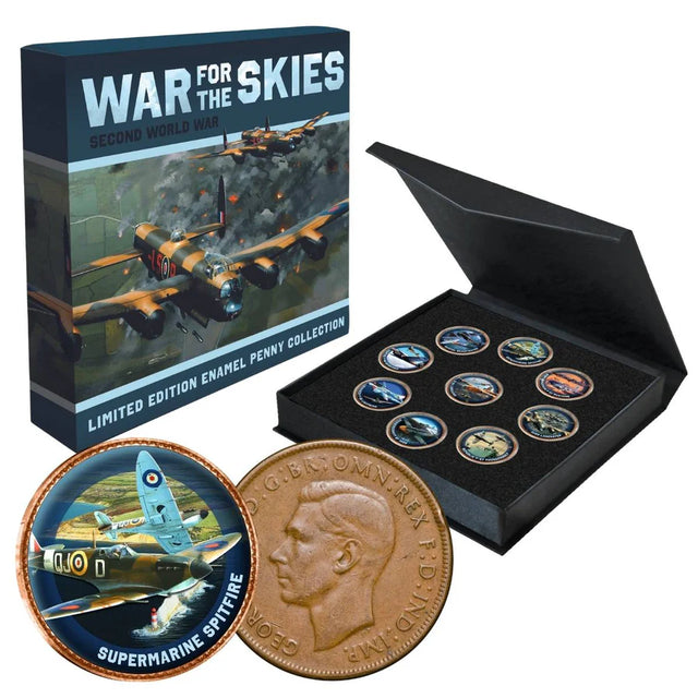 Set to take off with collectors & ignite the passions of young aviation enthusiasts, the War for the Skies Enamel Penny Collection is strictly limited to just 2,500 complete sets. Set within a premium presentation case that includes a beautifully illustrated and researched 6-page informative booklet, with a Certificate of Authenticity. Get yours now, before they go supersonic and disappear!