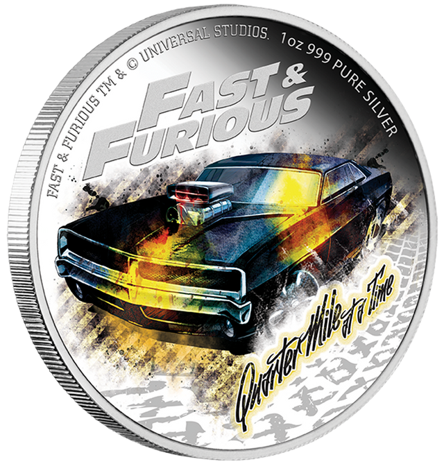 The coin’s reverse features an image of black muscle car, Fast and Furious logo and a famous quote “Quarter Mile at a Time” inscription.