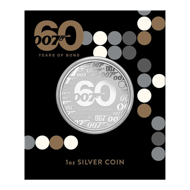 Struck from 1oz of 99.99% pure silver, this coin in card celebrates 60 Years of Bond, the legendary British spy featured in 25 blockbuster movies released by EON Productions since 1962.