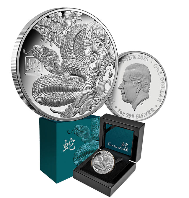 Uncoil excitement this Lunar New Year with a sterling new addition to your collection – the Lunar Snake $1 1oz Silver Proof Coin! This Niue legal tender gleams with the allure of its metal purity, mesmerizing design, and limited availability, ensuring that collectors will be eager to capture this tempting treasure. Are you ready to scale-up your collection in 2025 and celebrate the Lunar New Year in style? Then look no further…