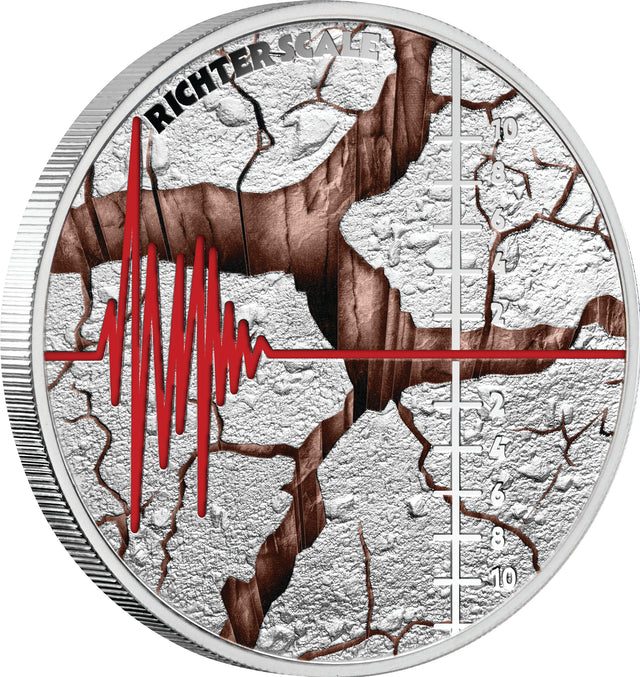 Based on a scale of 1.0 to 9.9, the Richter Scale measures the size of an earthquake - perhaps the most terrifying example of the power of nature. Capturing the essence of an earthquake, this 99.9% silver coin features a bright red portrayal of the Richter Scale in action, with the expert application of full-colour creating the illusion of deep cracks in the coin - representing the deadly fissures created by earthquakes!